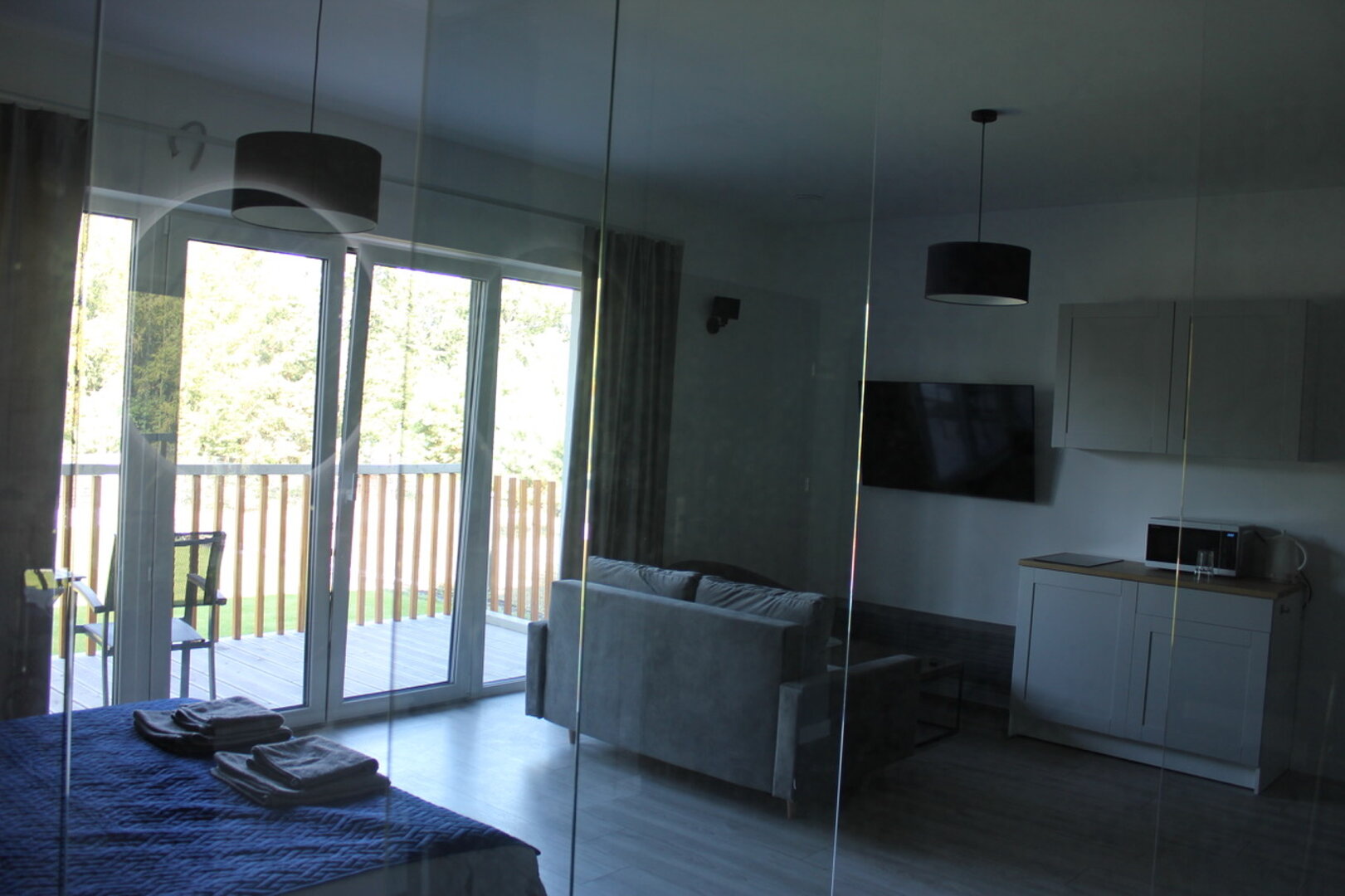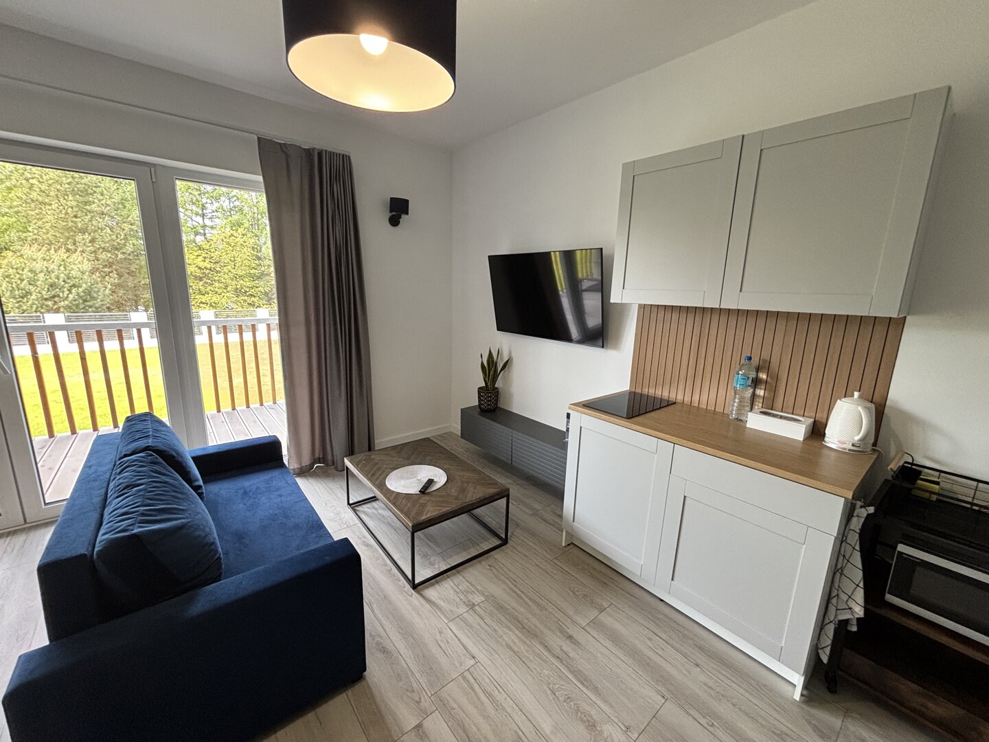 Nowoczesny apartament typu studio z tarasem i widokiem na jezioro. Odkryj komfort i elegancję w naszym w pełni wyposażonym apartamencie, idealnym dla maksymalnie 4 osób. Przestrzeń łączy funkcjonalny salon i sypialnię, tworząc przytulne, nowoczesne stu