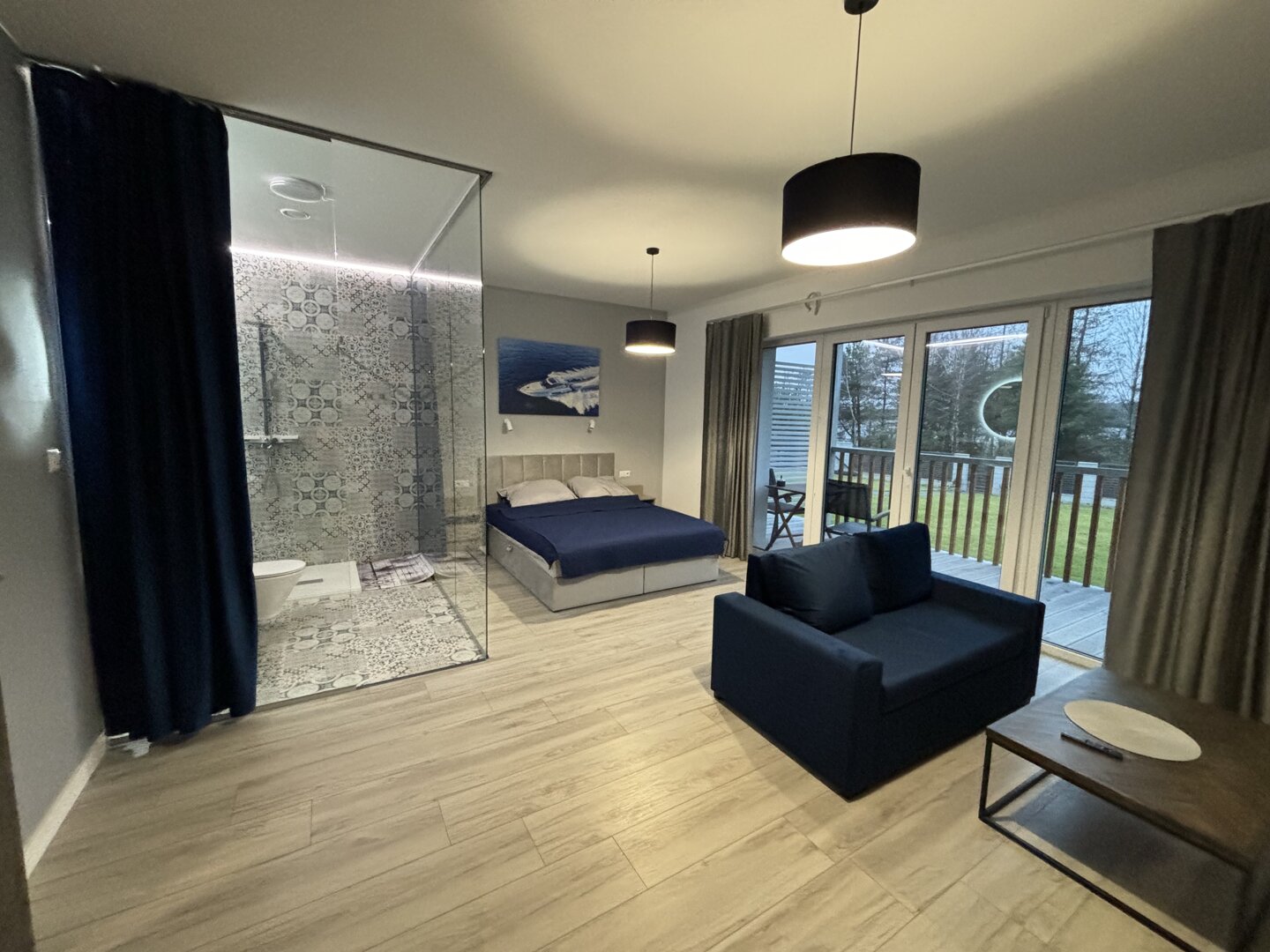 Nowoczesny apartament typu studio z tarasem i widokiem na jezioro.